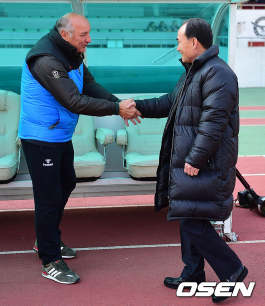 16일 오후 경기도 성남시 탄천종합운동장에서 열린 2014 K리그 클래식 성남 FC와 경남 FC의 경기 시작전 브랑코 바비치 감독대행과 김학범 감독이 악수를 나누고 있다.