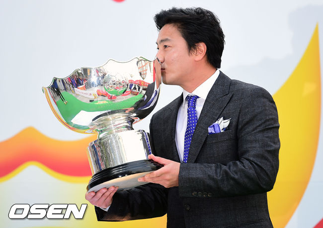 안정환이 트로피에 키스 세리머니를 하고 있다.
