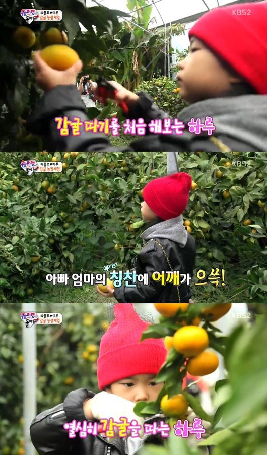 '슈퍼맨이 돌아왔다'의 타블로 딸 이하루가 감귤따기 달인포스를 풍겼다.