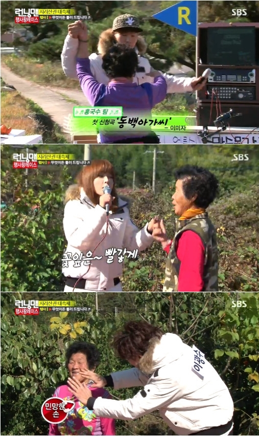 이날 이광수와 김종국, 홍진영은 한 팀을 이뤄 리어카를 타고 마을을 누볐다. 홍진영은 감을 따던 마을주민들로부터 신청곡으로 이미자의 '동백 아가씨'를 받아 흥겨운 무대를 선사했다.