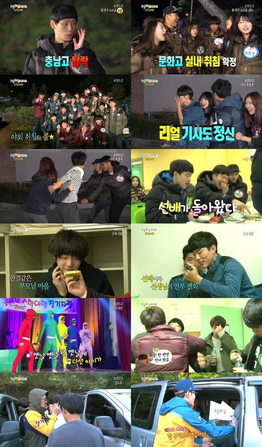 지난 16일 방송된 KBS 2TV ‘해피선데이-1박2일’(이하 1박2일)에서는 경상북도 영주에서 펼쳐진 모교후배들과 함께하는 ‘복불복 수학여행’ 특집의 마지막 이야기가 전파를 탔다. 김주혁, 김준호, 김종민, 정준영, 데프콘, 차태현은 후배들과 팀을 이뤄 다양한 복불복 게임도 하고 장기자랑도 했다.