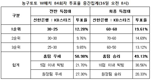 국민체육진흥공단(www.kspo.or.kr)이 발행하는 체육진흥투표권 수탁사업자인 스포츠토토 공식 온라인 발매사이트인 베트맨(www.betman.co.kr)이 오는 17일 오후 7시 인천도원체육관에서 벌어지는 신한은행-KB스타즈전을 대상으로 한 농구토토 W매치 84회차 투표율을 중간 집계한 결과, 전체 참가자의 49.13%는 신한은행의 우세를 예상하는 것으로 나타났다.
