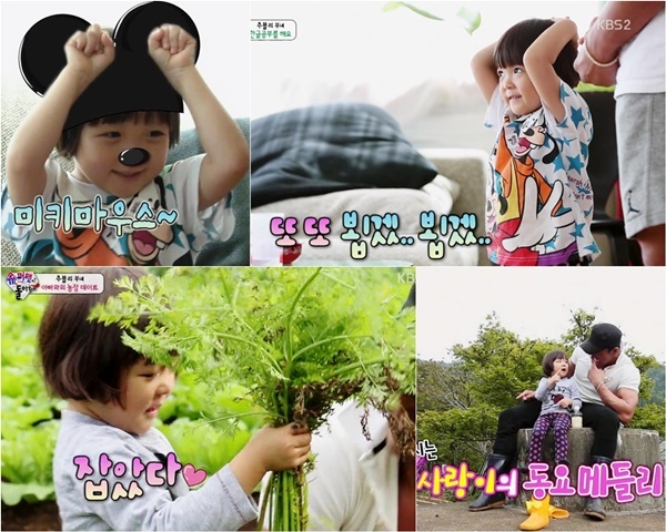 지난 16일 방송된 KBS 2TV ‘해피선데이-슈퍼맨이 돌아왔다’(이하 ‘슈퍼맨’) 52회에서는 아빠와 아이들 둘만의 행복한 시간 ‘아이 좋아 둘이 좋아’ 편이 그려졌다. 이중 사랑이는 일취월장한 한국어 실력만큼 쑥쑥 자라난 애교로 아빠 추성훈뿐만 아니라 시청자들의 마음까지 녹였다.