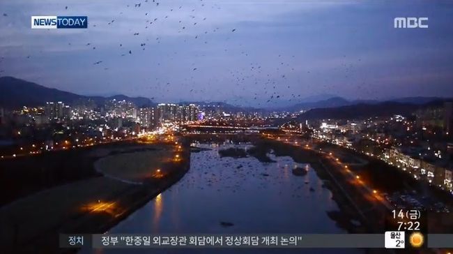 MBC는 지난 13일 울산 태화강에 몰려든 떼까마귀 무리가 비행을 하는 모습을 포착해 공개했다.
