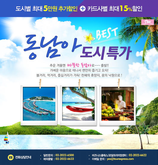 투어익스프레스 관계자는 "동남아 특가 항공원은 겨울 시즌을 맞아 특별한 여행을 즐기고 싶은 사람들과 여름에 미처 휴가를 떠나지 못했던 사람들, 그리고 연말과 연초에 색다른 추억을 만들고 싶은 사람들에게 많은 관심을 받을 것으로 기대한다"고 밝혔다.
