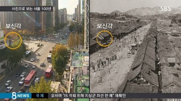 100년 전 옛 서울의 모습은 16일 SBS 카메라를 통해 대중에게 공개됐다. 서울 도심 사이를 여전히 지키고 있는 보신각 종이 인상적이다.
