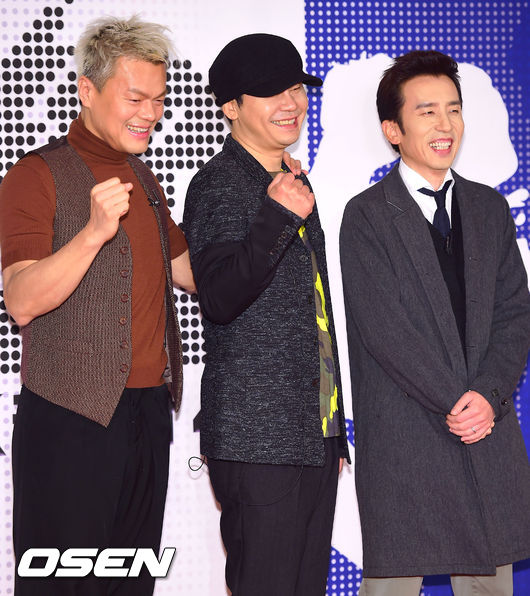 17일 오후 서울 목동 현대41타워 에서 진행된 SBS 예능프로그램 'K팝스타4' 기자간담회에서 박진영과 양현석, 유희열이 포즈를 취하고 있다.