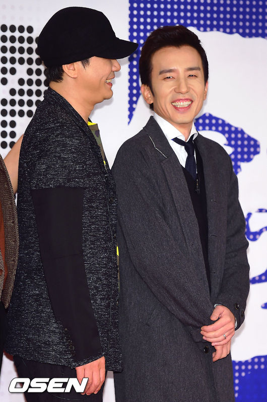 17일 오후 서울 목동 현대41타워 에서 진행된 SBS 예능프로그램 'K팝스타4' 기자간담회에서 양현석과 유희열이 포즈를 취하고 있다.