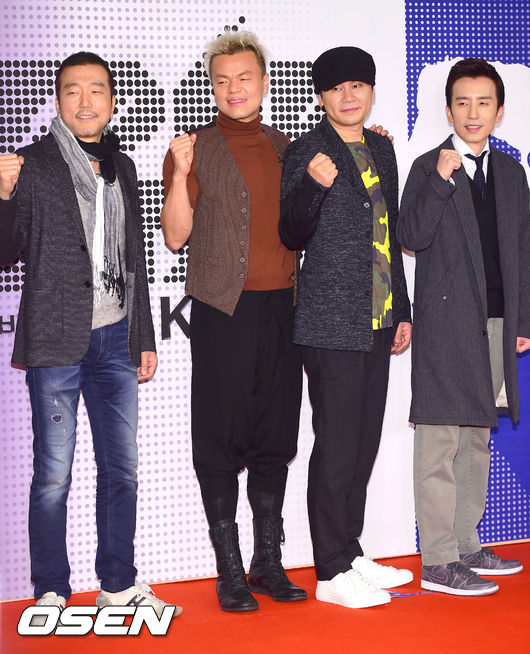 17일 오후 서울 목동 현대41타워 에서 진행된 SBS 예능프로그램 'K팝스타4' 기자간담회에서 박성훈 PD와 박진영, 양현석, 유희열이 포즈를 취하고 있다.