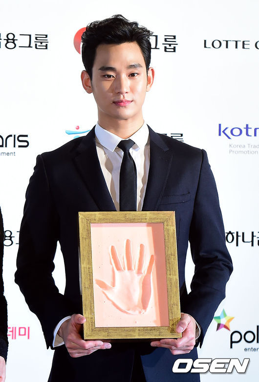 김수현이 핸드프린팅을 들고 포토타임을 갖고 있다.