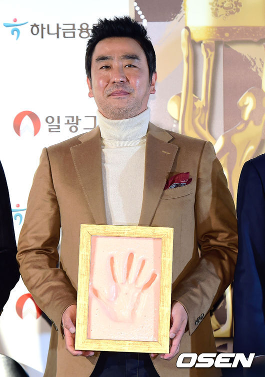 류승룡이 자신의 핸드프린팅을 들고 포토타임을 갖고 있다.