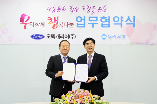 오텍캐리어(강성희 회장, www.carrier.co.kr)는 지난 14일 우리은행(이순우 은행장)과 소액기부를 통한 나눔문화 확산에 뜻을 같이하고, 나눔문화 확산 동참을 위한 협약식을 가졌다고 17일 밝혔다.