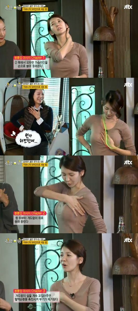 이어 “유선을 자극해 볼륨을 키워주는 효과가 있다. 등 뒤로부터 겨드랑이 위로 쓸어 올린다”며 “세 번째는 겨드랑이 살을 계속 꼬집어주면서 혈액순환을 촉진시켜 부기를 빼준다”고 설명했다.