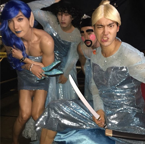 공개된 사진 속에는 각종 가발과 화려한 의상을 입고 영화 ‘겨울왕국’ 속 캐릭터 엘사로 변신한 멤버들의 모습이 보인다. 특히 이특은 파란 가발과 노출이 심한 드레스로 우람한 근육질 몸매를 드러낸 파격적인 모습으로 웃음을 자아낸다.