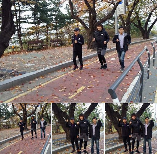 공개된 사진 속에는 산책로를 달리는 김장훈, 전원책. 진중권의 모습이 담겨 있다. 세 사람은 ‘파이팅’ 포즈를 취하며 화기애애한 장면을 연출했다.