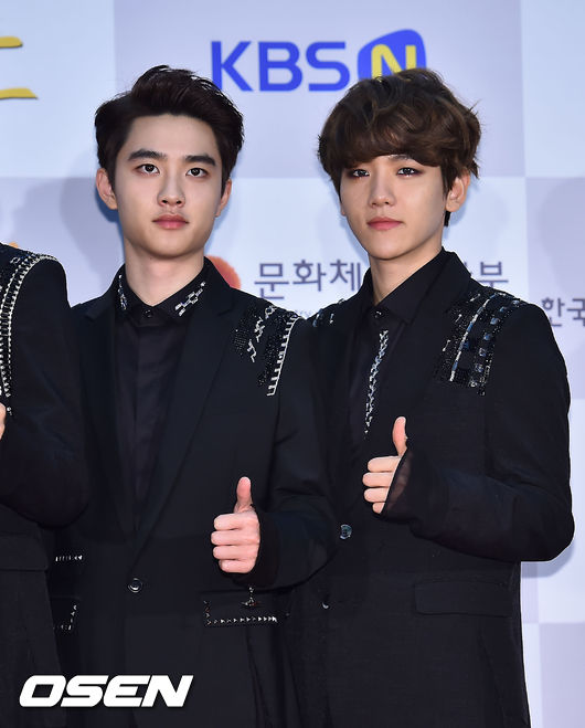 17일 오후 서울시 종로구 연건동 홍익대 대학로 아트센터 대강당에서 열린 '2014 대한민국 대중문화예술상'에서 엑소의 디오와 백현이 포토타임을 갖고 있다.