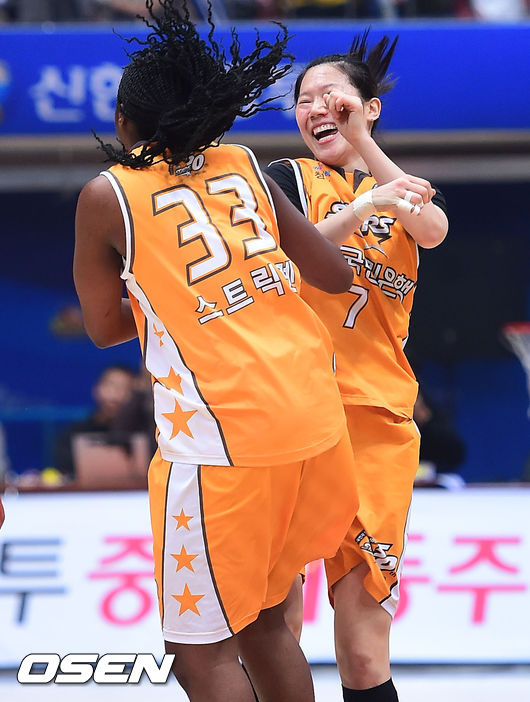 17일 오후 인천 도원실내체육관서 열린 KB국민은행 2014~2015 여자프로농구 인천 신한은행과 청주 KB스타즈의 경기, 1쿼터 KB스타즈 스트릭렌과 강아정이 속공에 이어 득점 후 세리머니를 하고 있다