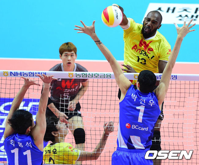 17일 오후 안산 상록수체육관에서 열린 '2014-2015 NH농협 V-리그' OK저축은행과 우리카드의 경기 1세트 시몬이 공격을 하고 있다.