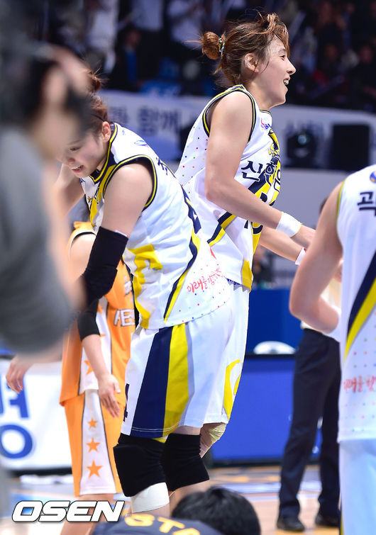 17일 오후 인천 도원실내체육관서 열린 KB국민은행 2014~2015 여자프로농구 인천 신한은행과 청주 KB스타즈의 경기,3쿼터 신한은행 최윤아가 바스켓카운트를 얻은후 김단비와 세리머니를 하고 있다.