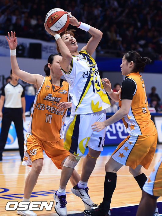 17일 오후 인천 도원실내체육관서 열린 KB국민은행 2014~2015 여자프로농구 인천 신한은행과 청주 KB스타즈의 경기,3쿼터 신한은행 김단비가 골밑슛을 시도하고 있다.