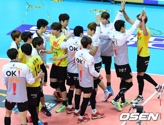 17일 오후 안산 상록수체육관에서 열린 '2014-2015 NH농협 V-리그' OK저축은행과 우리카드의 경기 종료 후 OK저축은행 선수들이 하이파이브를 하고 있다.