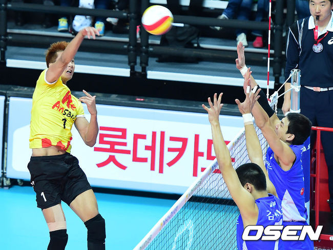 17일 오후 안산 상록수체육관에서 열린 '2014-2015 NH농협 V-리그' OK저축은행과 우리카드의 경기 3세트 송명근이 공격을 하고 있다.