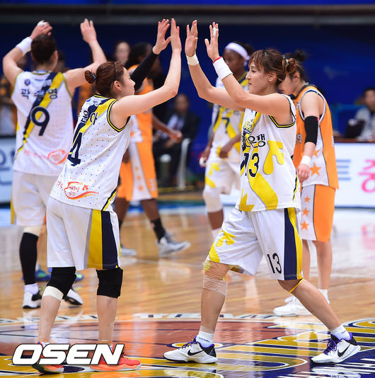 경기종료 후 신한은행 최윤아와 김단비가 하이파이브를 하고 있다. / soul1014@osen.co.kr