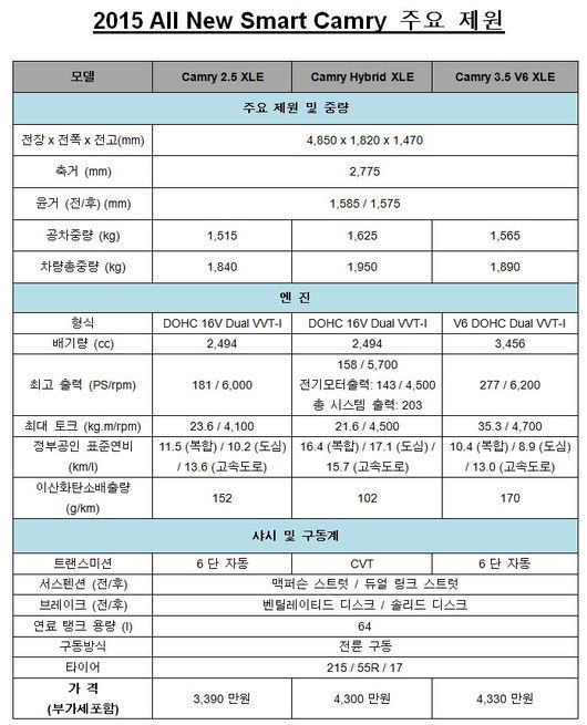 2000만 원대 캠리는 아니었지만 그래도 충분히 경쟁력 있는 가격이다. 한국토요타자동차가 18일부터 전국 토요타 전시장에서 ‘2015 올 뉴 스마트 캠리(2015 All New Smart Camry)’ 의 판매에 들어가는데 가장 낮은 모델의 가격이 3,390만 원이다.