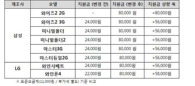 SK텔레콤은 일반폰 8개 기종 구입 고객에게 요금제에 관계없이 최소 지원금 8만원을 제공한다. 대상 단말은 삼성전자의 미니멀 폴더, 와이즈 2(2G/3G), 마스터 3G, 마스터 듀얼(2G) 및 LG전자의 와인 샤베트, 와인폰4 등 총 8종이다.