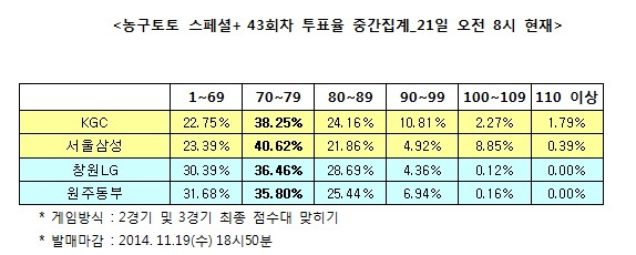 1경기 KGC-삼성전 역시 KGC(38.25%)와 삼성(40.62%)가 모두 70~79점대를 기록할 것이라는 전망이 다수를 차지했다.