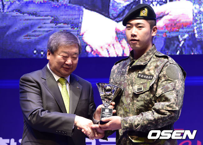 18일 오후 서울 더케이 서울 호텔에서 열린 '2014 한국 야쿠르트 세븐 프로야구 최우수선수(MVP), 최우수신인선수 선정 및 부문별 시상식'에서 상무 고원준이 퓨처스리그 남부리그 투수상을 수상하고 있다.