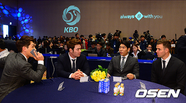 18일 오후 서울 양재동 더케이 서울 호텔에서 열린 '2014 한국 야쿠르트 세븐 프로야구 최우수선수(MVP), 최우수신인선수 선정 및 부문별 시상식'에서 넥센 서건창, 박병호, 강정호, 삼성 밴덴헐크가 이야기를 나누고 있다.