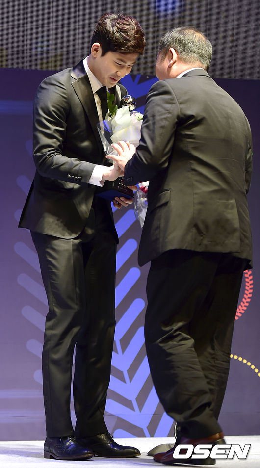 18일 오후 서울 더케이 서울 호텔에서 열린 '2014 한국 야쿠르트 세븐 프로야구 최우수선수(MVP), 최우수신인선수 선정 및 부문별 시상식'에서 NC박민우가 신인상을 수상하고 꽃다발을 받고 있다.