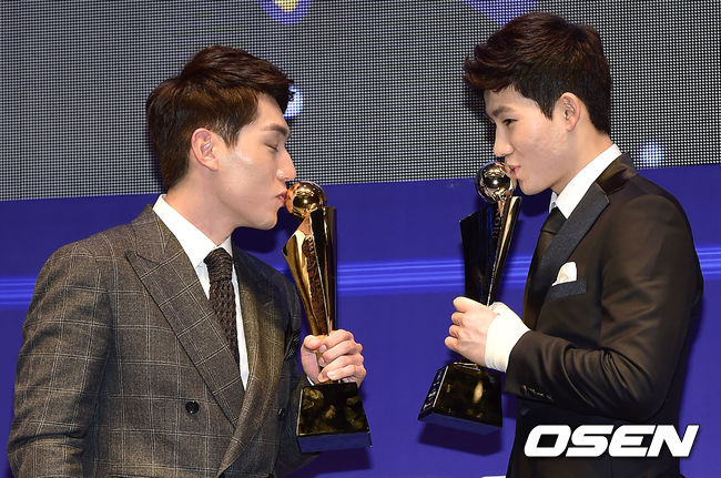 18일 오후 서울 더케이 서울 호텔에서 열린 '2014 한국 야쿠르트 세븐 프로야구 최우수선수(MVP), 최우수신인선수 선정 및 부문별 시상식'에서 MVP를 수상한 서건창과 신인상을 수상한 박민우가 트로피에 키스하고 있다.