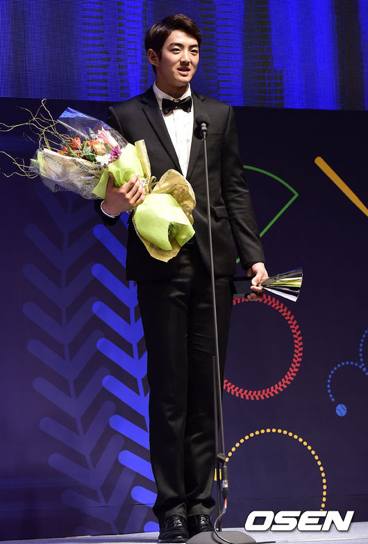 18일 오후 서울 더케이 서울 호텔에서 열린 '2014 한국 야쿠르트 세븐 프로야구 최우수선수(MVP), 최우수신인선수 선정 및 부문별 시상식'에서 상무 구자욱이 퓨처스리그 남부리그 수위타자상을 수상하고 소감을 밝히고 있다.
