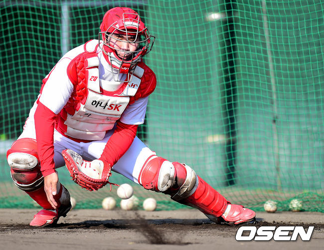 SK 포수 이재원이 블로킹 연습을 하고 있다.