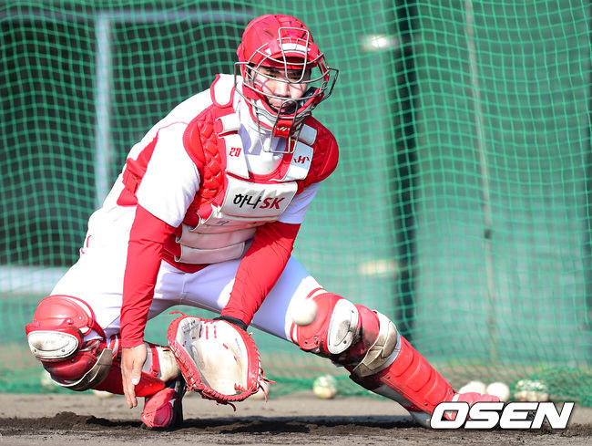 SK 포수 이재원이 블로킹 연습을 하고 있다.