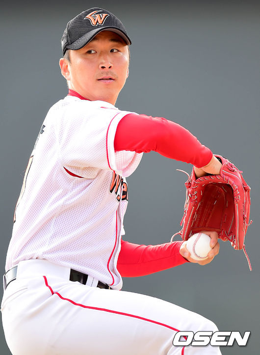 SK 정우람이 캐치볼로 몸을 풀고 있다.