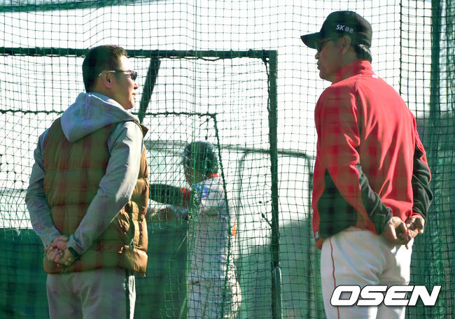 SK 김용희 감독과 박경완 육성총괄이 대화를 나누고 있다.