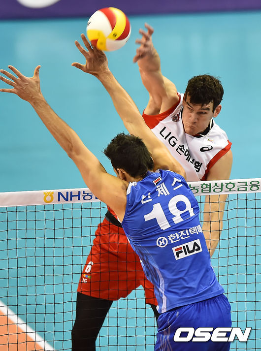 18일 오후 경상북도 구미시 광평동 박정희체육관에서 열린 '2014-2015 NH농협 V-리그' LIG손해보험과 대한항공의 경기, 1세트 LIG손해보험 에드가가 대한항공 산체스의 블로킹을 피해 강타를 날리고 있다.
