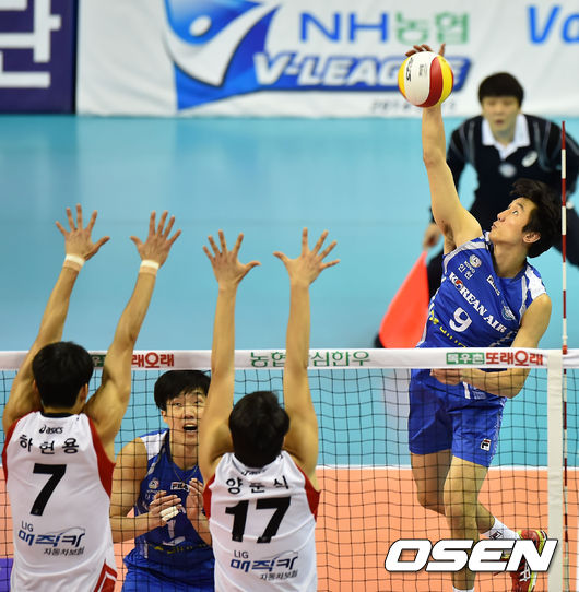 18일 오후 경상북도 구미시 광평동 박정희체육관에서 열린 '2014-2015 NH농협 V-리그' LIG손해보험과 대한항공의 경기, 1세트 대한항공 곽승석이 강타를 날리고 있다.