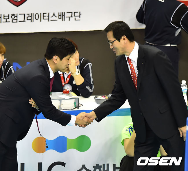 18일 오후 경상북도 구미시 광평동 박정희체육관에서 열린 '2014-2015 NH농협 V-리그' LIG손해보험과 대한항공의 경기, 경기 전 양팀 감독이 악수를 나누고 있다.