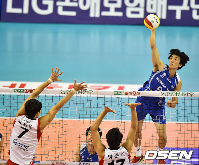 18일 오후 경상북도 구미시 광평동 박정희체육관에서 열린 '2014-2015 NH농협 V-리그' LIG손해보험과 대한항공의 경기, 1세트 대한항공 곽승석이 강타를 날리고 있다.