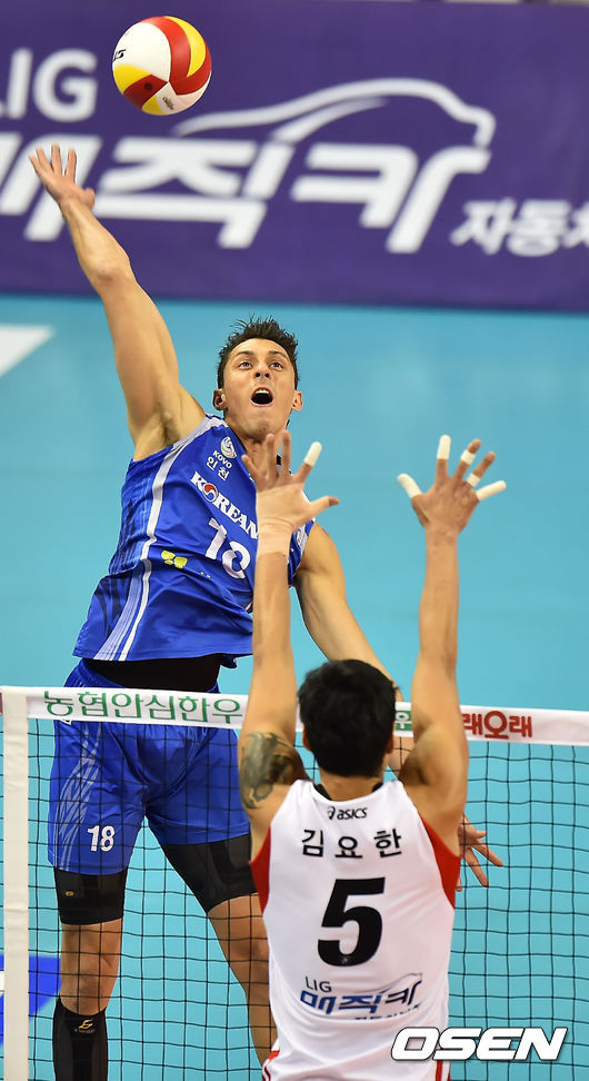 18일 오후 경상북도 구미시 광평동 박정희체육관에서 열린 '2014-2015 NH농협 V-리그' LIG손해보험과 대한항공의 경기, 1세트 대한항공 산체스가 강타를 날리고 있다.