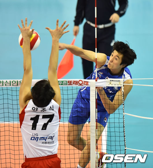 18일 오후 경상북도 구미시 광평동 박정희체육관에서 열린 '2014-2015 NH농협 V-리그' LIG손해보험과 대한항공의 경기, 1세트 대한항공 곽승석이 강타를 날리고 있다.