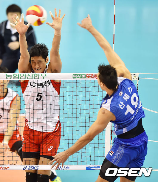 18일 오후 경상북도 구미시 광평동 박정희체육관에서 열린 '2014-2015 NH농협 V-리그' LIG손해보험과 대한항공의 경기, 2세트 LIG손해보험 김요한이 대한항공 산체스의 강타를 블로킹하고 있다.