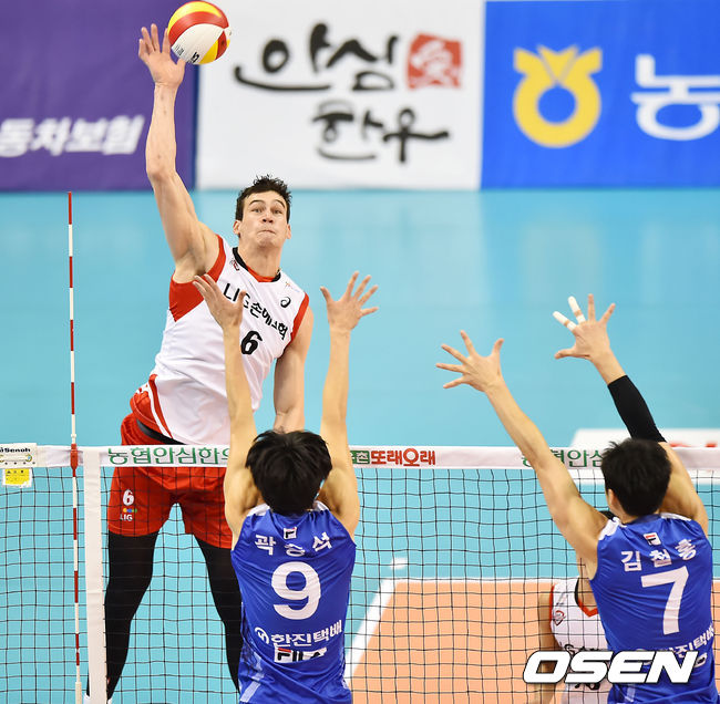 18일 오후 경상북도 구미시 광평동 박정희체육관에서 열린 '2014-2015 NH농협 V-리그' LIG손해보험과 대한항공의 경기, 2세트 LIG손해보험 에드가가 강타를 날리고 있다.