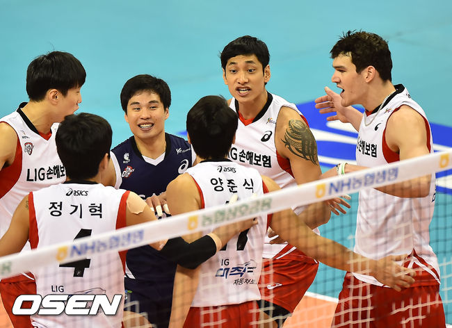 18일 오후 경상북도 구미시 광평동 박정희체육관에서 열린 '2014-2015 NH농협 V-리그' LIG손해보험과 대한항공의 경기, LIG손해보험 김요한이 공격에 성공한 후 기쁨을 나누고 있다.