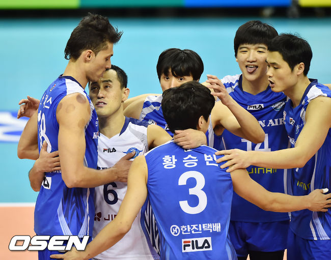 18일 오후 경상북도 구미시 광평동 박정희체육관에서 열린 '2014-2015 NH농협 V-리그' LIG손해보험과 대한항공의 경기, 3세트 대한항공 선수들이 공격에 성공한 후 포옹을 하고 있다.