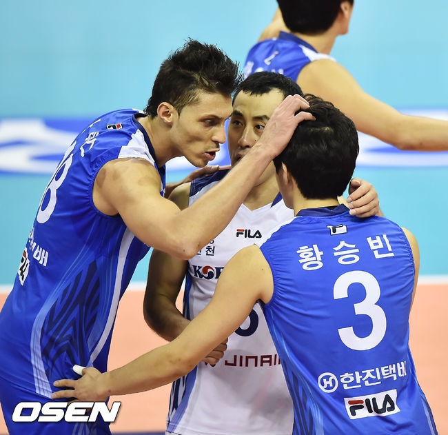 18일 오후 경상북도 구미시 광평동 박정희체육관에서 열린 '2014-2015 NH농협 V-리그' LIG손해보험과 대한항공의 경기, 3세트 대한항공 산체스가 공격에 성공한 후 황승민과 얘기를 나누고 있다.
